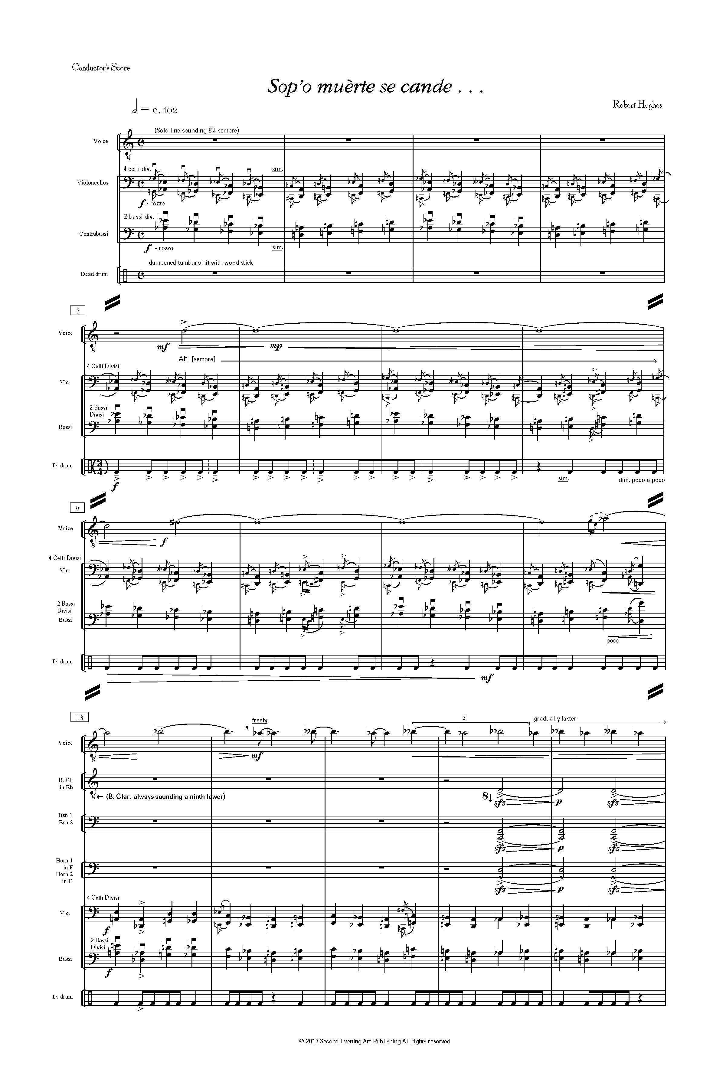 Sop'o Muèrte se Candeon an Italian proverb![]() for High Tenor and Orchestra by Robert Hughes Duration c. 8 minutes More about the workThe title Sop'o muèrte se cande . . . (1983-2013) is taken from an Italian proverb that translates, Upon death one sings praises. Score and PartsInstrumentation download pdf Catalogue (BMI)Music for Orchestra and Large Ensembles by Robert Hughes Example from the music score